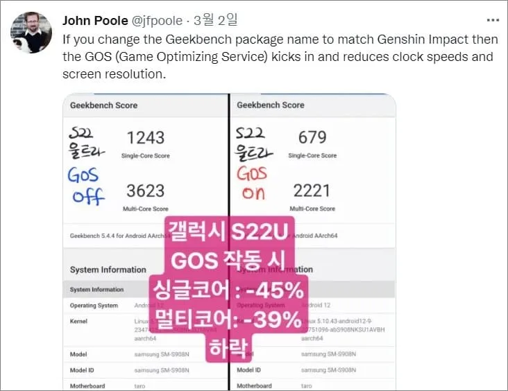하지만 갤럭시의 GOS 사태를 접한 긱벤치 측에서는 실제로 갤럭시 제품들의 성능을 재점검한 뒤, 자신들의 벤치마크 차트에서 갤럭시를 퇴출시키고 말았다. 이게 얼마나 심각한 문제였던지, 실제 긱벤치 벤치마크를 만든 개발자가 나서서 이와 관련된 내용을 발표했을 정도였다. 참고로 GOS가 적용된 상태로 성능을 확인해보면, 갤럭시S22 울트라 모델의 성능이 2년 전에 출시됐던 갤럭시S20 혹은 아이폰10S와 비슷해진다. 불과 며칠 전에 산 신상 스마트폰이 2년전에 나왔던 스마트폰의 성능과 비슷하다면, 이를 받아들일 수 있는 사람들이 얼마나 될까?